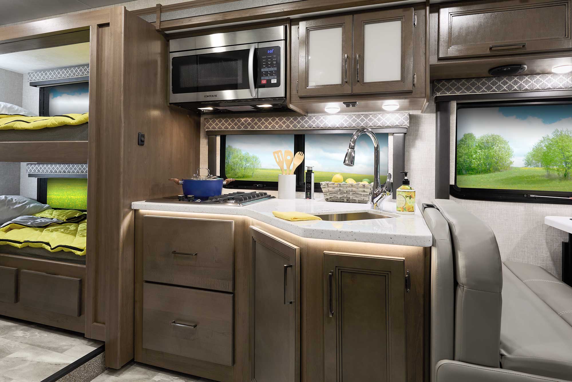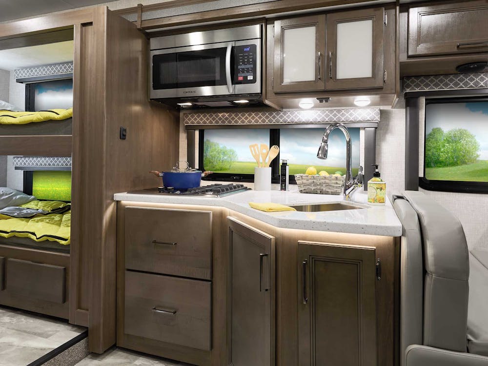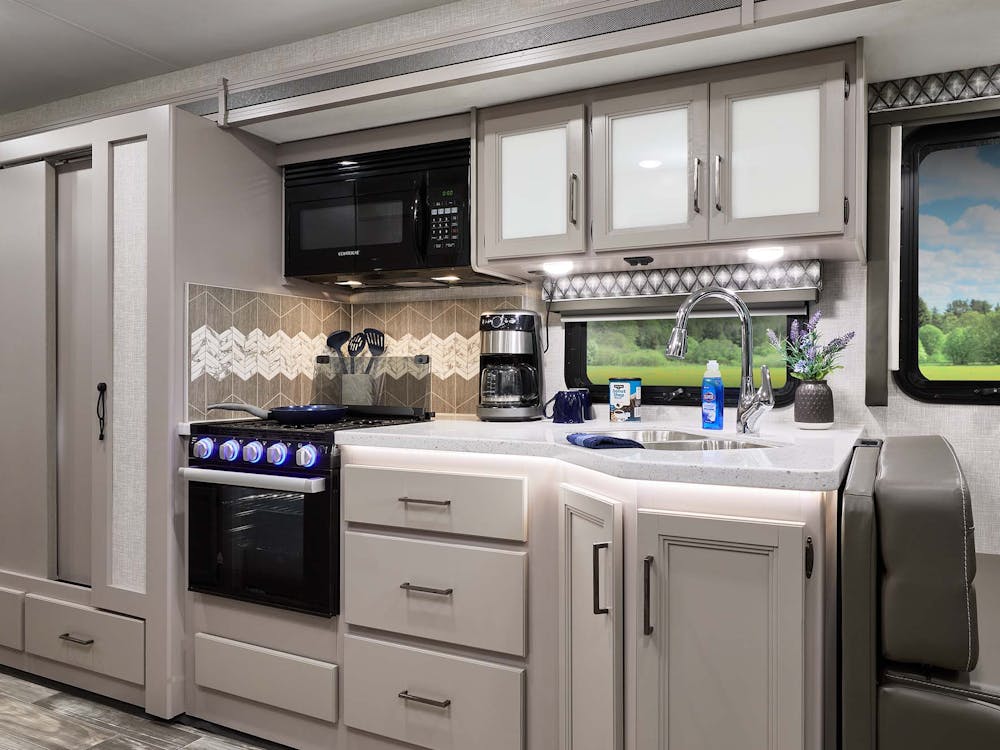 Hurricane's kitchen handles everything from prepping big meals to throwing a few items together. Keep ingredients fresh in the double-door refrigerator. Solid surface countertops provide plenty of space for meal prep. Create tasty camping meals with the three-burner gas cooktop and over-the-range microwave oven. Clean-up is quick, thanks to the double bowl sink with a pull-down sprayer. This way, you can spend less time in the kitchen and more time making memories with your loved ones.