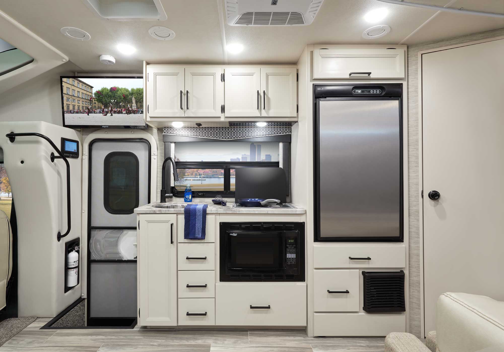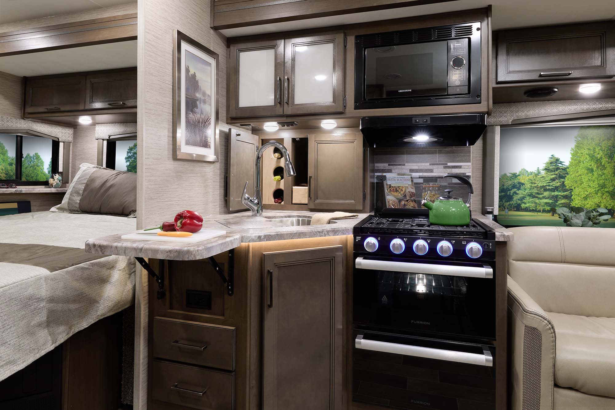 Compass AWD is designed to be easy to live in and drive. Whether you travel on weekends or live in your RV full-time, this versatile Class B+ RV will make you feel right at home. The kitchen features pressed laminate countertops that make for the perfect snack preparation station. There’s also a two-burner gas cooktop with a glass cover, convection microwave, and refrigerator available in every floor plan for meals on the go.
