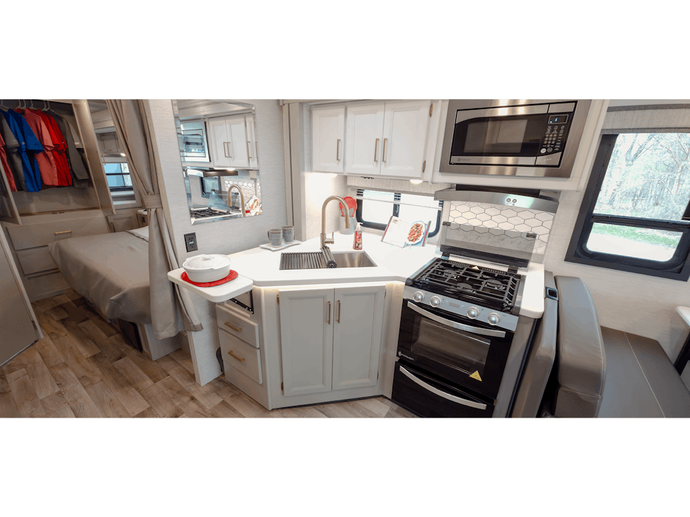 This Class A motorhome is made with pets and families in mind, so everybody can come along for the ride. Enjoy pet-friendly features like the pull-out Kibble Station™ and the Pet-Link™ multi-purpose tie-down, which are perfect for keeping your pet secure and comfortable. The Resonate® offers something for everyone, with various floor plans and stylish designs to meet your needs.